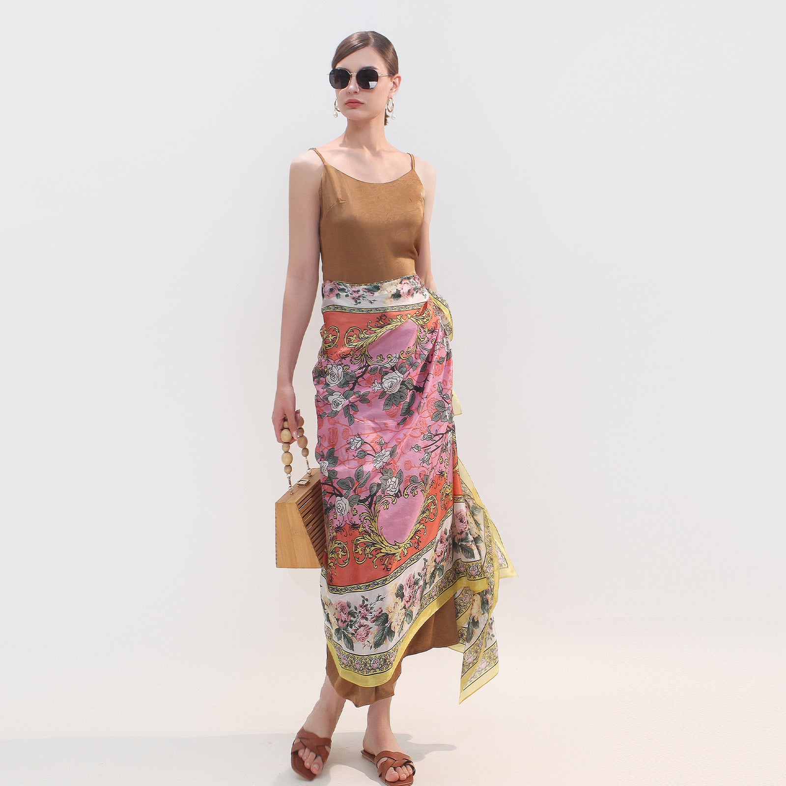Such beautiful, saturated, rich colors and clear, vibrant, pattern designs. Unbelievably light weight yet folds flat to a tiny little square. Ultra buttery soft! The size is perfect for so many alternate ways to wear this! Full coverage as a swim cover up halter dress and a maxi skirt on a 5’11” size 10-12 (USA) woman! It’s so elegant that I will wear it as a scarf for formal evening events too! Perfect for our dream anniversary trip to Italy next year!! This is really a great buy - higher quality than the bargain price suggests.